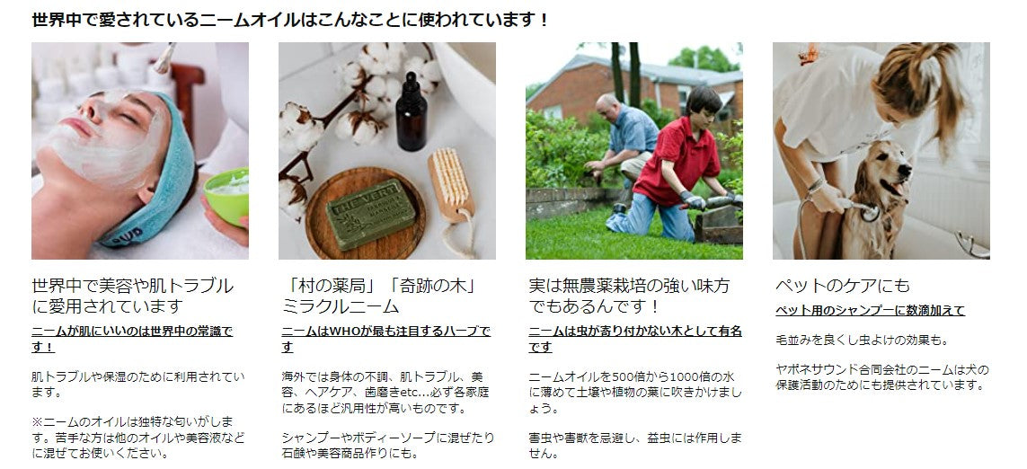 Neem Oil/Azadirachta Indica Oil" from Japonesound LLC, which handles the highest quality Ayurvedic herbs imported for the first time in Japan under the motto "Better than domestic quality at a price that is close to your life"! This is the first Himalayan-produced Western organic standard product imported to Japan, and is a pure oil with no added fragrance or extra ingredients. Enjoy the world standard quality of products loved all over the world for skin and hair health and beauty. Easy-to-use dropper type is also available.