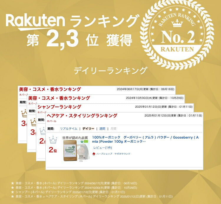 「国産以上の品質を生活に寄り添う価格で」をモットーに、日本初輸入の最高品質アーユルヴェーダハーブを取り扱うヤポネサウンド合同会社から「グーズベリー(アムラ)パウダー/Gooseberry('Amla) Powder」が登場! 日本初輸入のヒマラヤ産欧米オーガニック規格品で、きめ細やかに仕上げたパウダータイプ。もともと食用にも使用できるものを贅沢にヘアケアパウダーとして発売しました。 1gのパウダーを作るのに100g以上のオーガニックアムラを使用。 アムラはビタミンCと高濃度タンニンを豊富に含む為、髪にいいことがたくさん。。アムラは酸性の性質を持っている為、髪の毛の引き締めにも。 ヘアサロンでも髪の毛のトリートメントまで、総合的に髪の毛をサポートしてくれるパウダーとして人気があります。 【使い方】 ・トリートメントとして スプーン一杯くらいのアムラをお湯100m?くらいに溶かし髪全体になじませる。10分程度置いたら洗い流す。 アムラとシカカイやニームを混ぜてペースト状にして髪に馴染ませる。10分程放置して洗い流す。 ・シャンプーとして 軽く濡らした髪と地肌に適量のパウダーを手に取り馴染まるように揉み込む。 シカカイやニームと混ぜて使うと効果的。 ・食べ物と一緒に摂取する グーズベリー(アムラ)は、酸味、甘味、苦味、辛味、渋味、全てを感じることができる唯一の果物と言わています。 アムラパウダー1g中に、レモン約1.5個分のビタミンC、赤ワイン約1杯分のポリフェノールが含まれていると言われており、1日摂取量を簡単に摂取する事ができます。メーカー希望小売価格はメーカーサイトに基づいて掲載しています